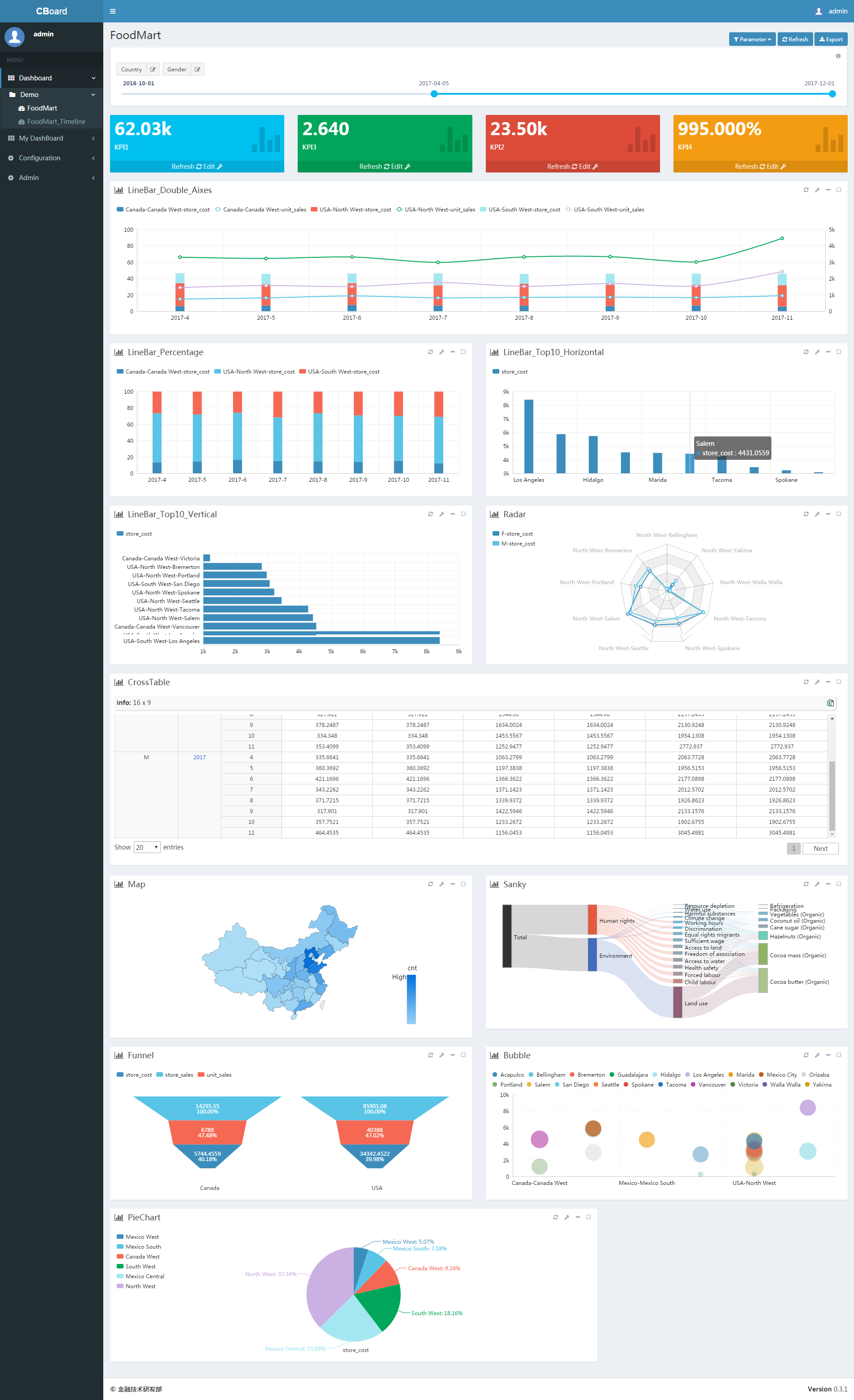 - Easy to implement your own DataProvider to connect any data source. Even for expensive commercial BI suite, it's not possible to connect all the NOSQL and NewSQL data source in the era of big data. Due to the schema of NOSQL are various, such as hash tables, arrays, trees, maps, etc., different people using the same NoSQL products designed Schema may vary widely. The user who most familiar with their storage schema are the user themselves. And it's easy to find a Java programmers to code a Class to connect their own data source. So we leave this part of work to the end user with an easy extended data connection framework in CBoard